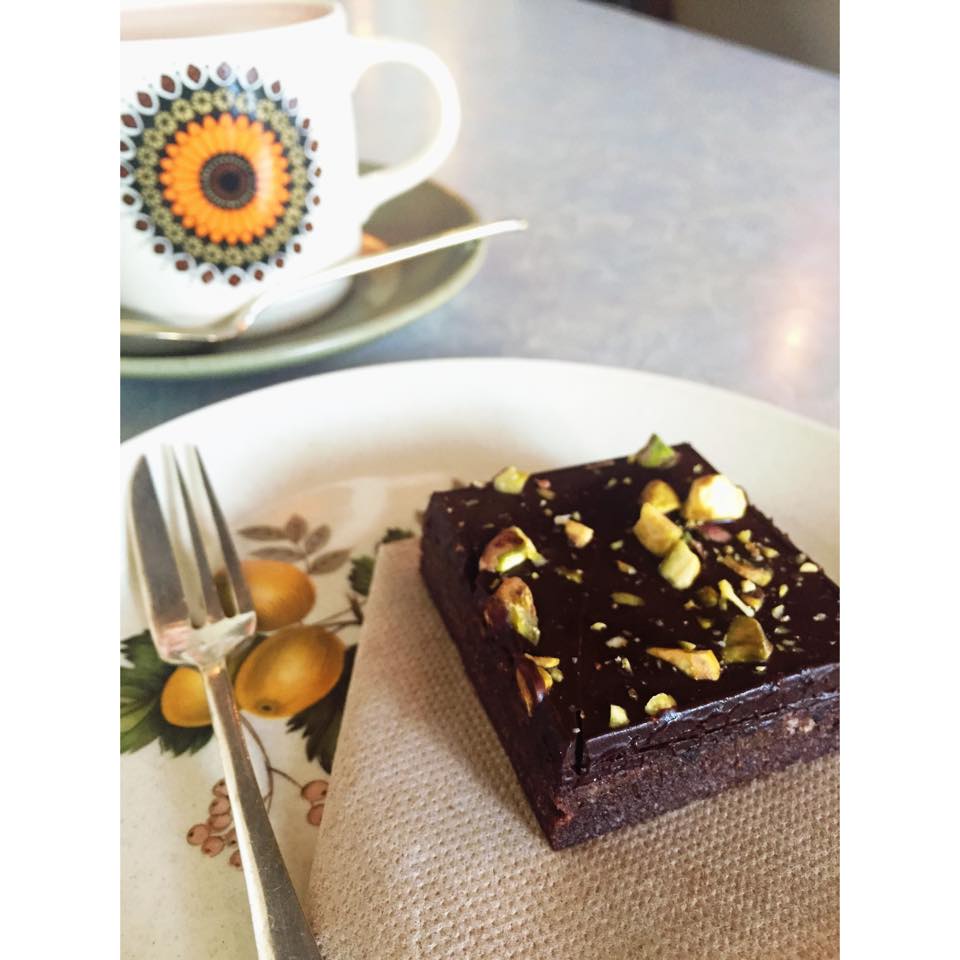a super friendly guy (with mad dreadlocks) welcomed us in from behind the counter, and then a lovely waitress (with an outfit probably made from material from when my father was born) took us to a table, handing us menus and giving us glasses of water. there was a great mix between soulful and indie tunes playing throughout our meal which I found made my dining experience more attractive. remember having tea at your grandparents house with their kitsch coloured dinnerware? well, Carly and myself do, and being served with these brought a sense of nostalgia.